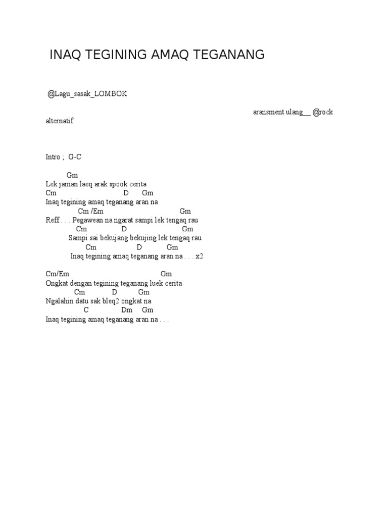 27 Juli 2016 3 Januari 2017 admin. Em D Cm E Fm A Bm G F F C Dm Dm B Chords for Lagu Sasak Lombok - Inaq Tegining Amaq Teganang with song key BPM capo transposer play along with guitar piano ukulele mandolin. Chord Jumpring Band - Lampak Midang.