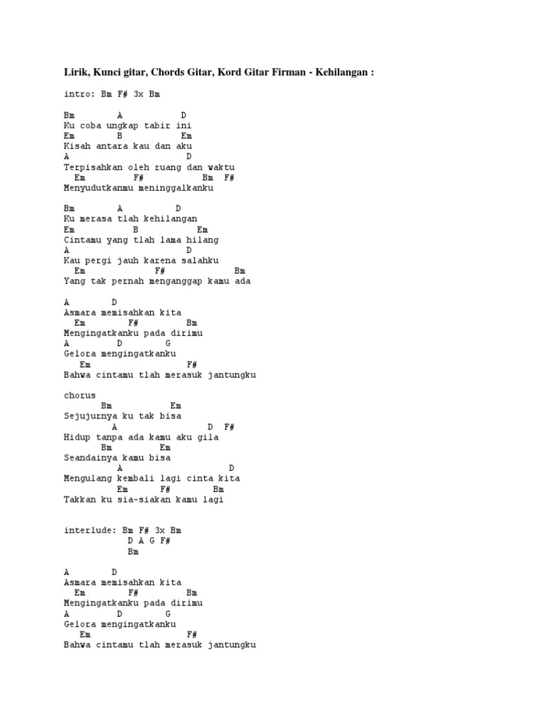 Chord gitar Kehilangan Firman lengkap dengan lirik Ku coba ungkap tabir ini kisah antara kau dan aku terpisahkan oleh ruang dan waktu menyudutkanmu Rabu 23. Intro D Em 4x D Em buta hatiku D Em oleh keindahanmu G Fm Em hanya ada dirimu di dalam hatiku A di dalam hidupku D Em tidakkah kau tahu D Em ku sangat mencintaimu G Fm namun kau tak pernah merasa Em A seperti yang ku rasakan kepadamu Chorus Em A selama ini aku salah D G mengartikan maksud di balik hatimu Em A selama ini aku anggap D G engkau benar-benar cinta. Am G C ku merasa tlah kehilangan.