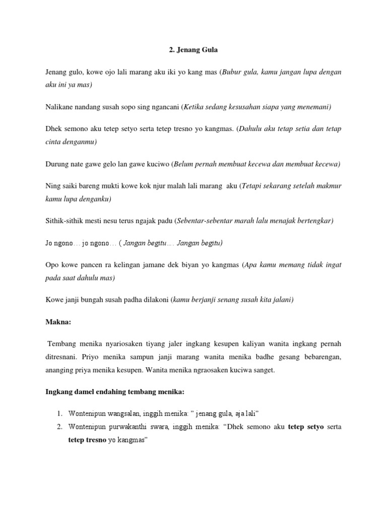 Aren Kadingaren Mbalung klapa geleme mung ethok ethokan. Lanteng Pindang lulang kacek apa aku karo kowe. Jenang gula kowe aja lali marang aku.