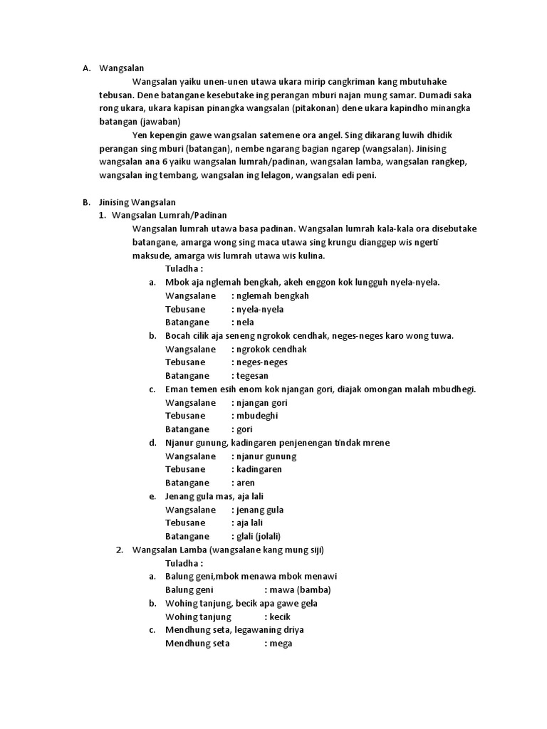 Tuhu eman wong anom wedi kangelan. Sowan kula ing ngriki namung angebun-ebun enjang anjejawah sonten. Wangsalan yaiku tetembungan utawa ukara saemper cangkriman nanging batangane wis ana ing perangan burine mung dicangking sawanda utawa luwih.