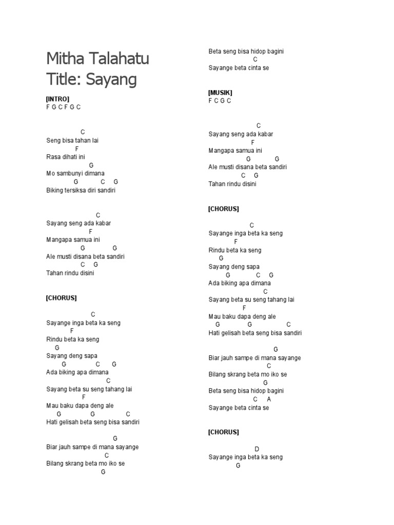 C F Dm G C F Sampai kapan lai beta musti nanti se kumbali Dm C G ale su lama pigi tinggal beta sandiri disini C F sampe oras ini beta masih yakin se pasti kombali Dm G C meski tetap saja se seng pung ada kabar lae F G dimana se nona sayang Em Am apa batul yang dong bilang Dm G kalau ale disana su kaweng REFF C F sio kanapa. Kunci Gitar Mitha talahatu Sayang. Mitha Talahatu - Sayang LyricsHit the to join the notification squadSubscribe to Music and Lyrics for more lyric videos.
