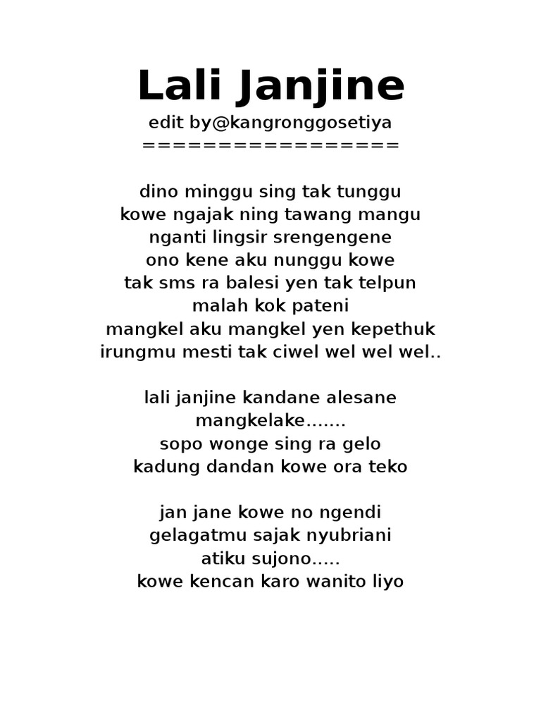 Ojo mutung kabeh mau wis tak pitung. Lirik Lagu Lali Janjine Sragenan Tarik siissttt______ Dino Minggu sing tak tunggu Kowe ngajak neng Tawangmangu Nganti lingsir srengengene Ono kene aku nunggu Tak SMS ra mbalesi Yen tak telpon. Yen tak tunggu Minggu ra ono lamaran.