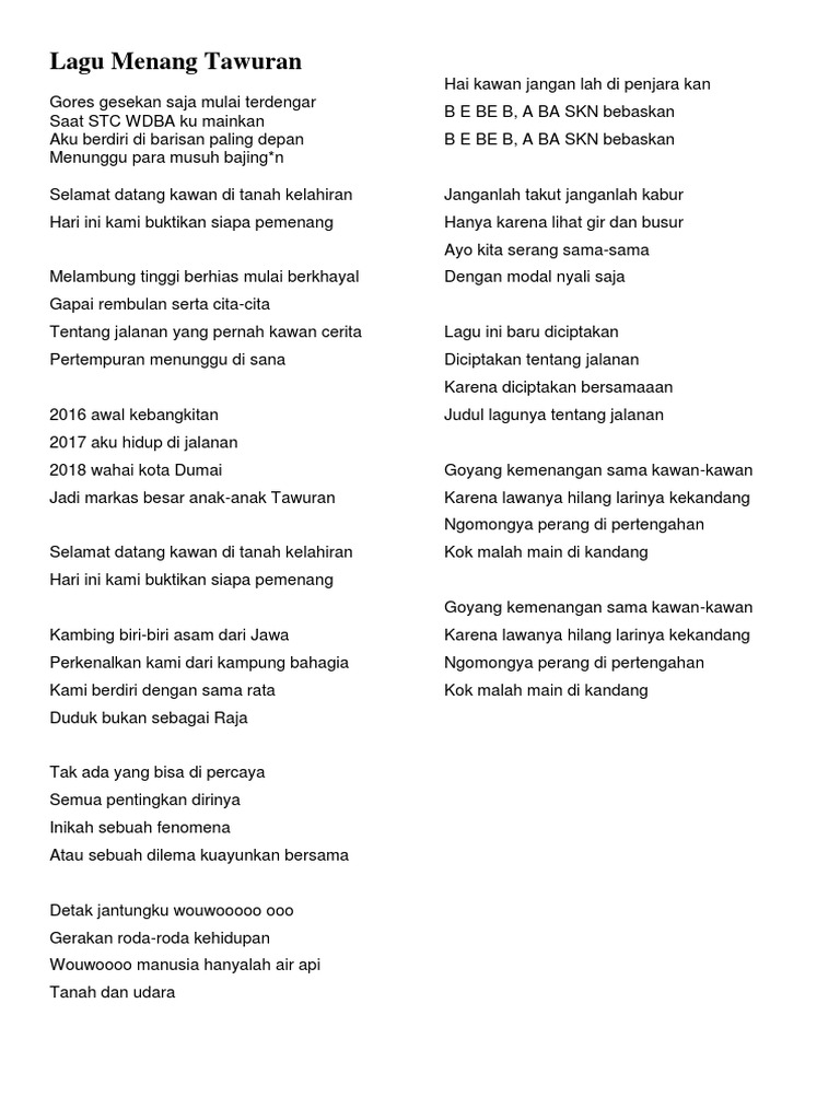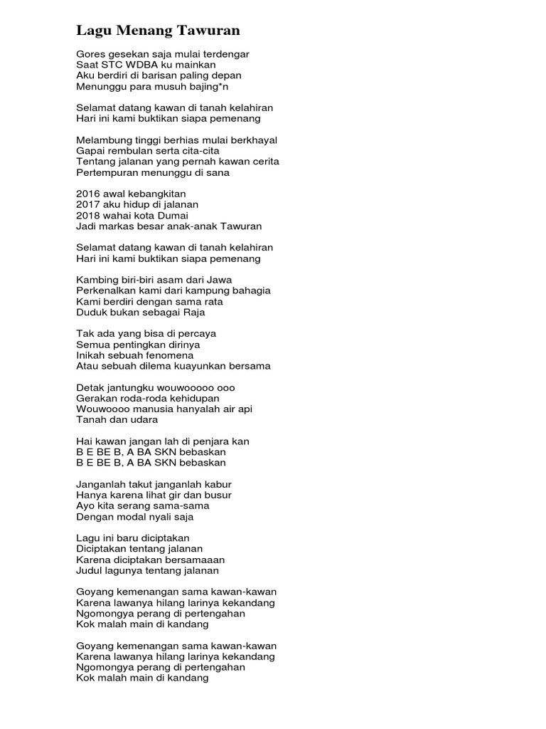 Lirik Tawuran Pelajar oleh Endank Soekamti. Tangis dan tawa semuanya bersama Bagai udara ku perlukan sentiasa Ku putus kata hidup tanpa kamu Bukan yang. Lirik Lagu Menang Tawuran Goyang Kemenangan Sama Kawan-Kawan By Ikal Saputra 149 PM 6 comments Hallo Teman-teman semua buat kalian yang gemar dengan lagu tentang jalanan atau sebuah tantangan kehidupan kami telah tuliskan dibawah ini.