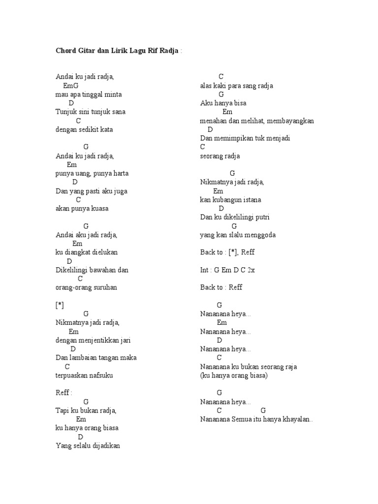 G Em D C G andai ku jadi radja emg mau apa tinggal minta D tunjuk sini tunjuk sana C dengan sedikit kata G andai ku jadi radja Em punya uang punya harta D dan yang pasti aku juga C akan punya kuasa G andai aku jadi radja Em ku diangkat dielukan D dikelilingi. G Em D C G Andai ku jadi radja EmG mau apa tinggal minta D Tunjuk sini tunjuk sana C dengan sedikit kata G Andai ku jadi radja Em punya uang punya harta D Dan yang pasti aku juga C akan punya kuasa G Andai aku jadi radja Em ku diangkat dielukan D Dikelilingi bawahan dan C orang-orang suruhan G Nikmatnya jadi radja Em dengan. Lagu yang dirilis pada 14 Januari 1997 ini merupakan singel utama milik grup musik rif dari album studionya Radja.